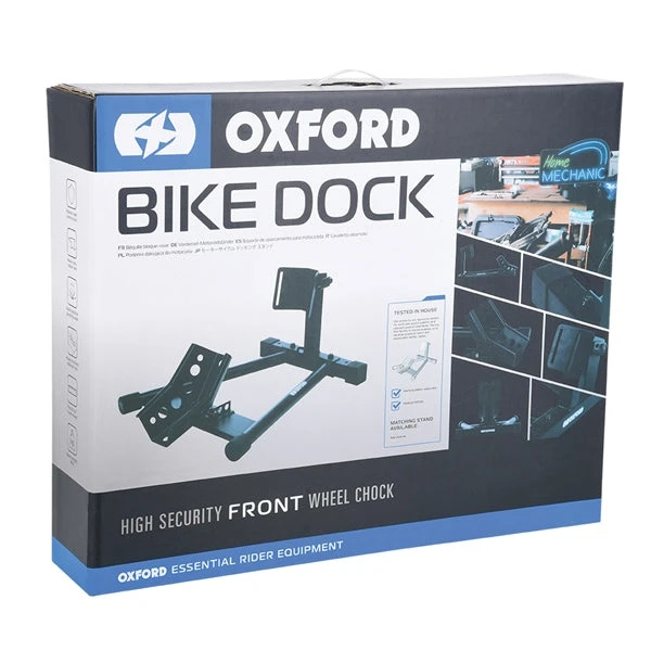 Le socle Bike Dock fixe la roue avant d’une moto pour la garder droite lorsqu’elle est entreposée ou transportée.